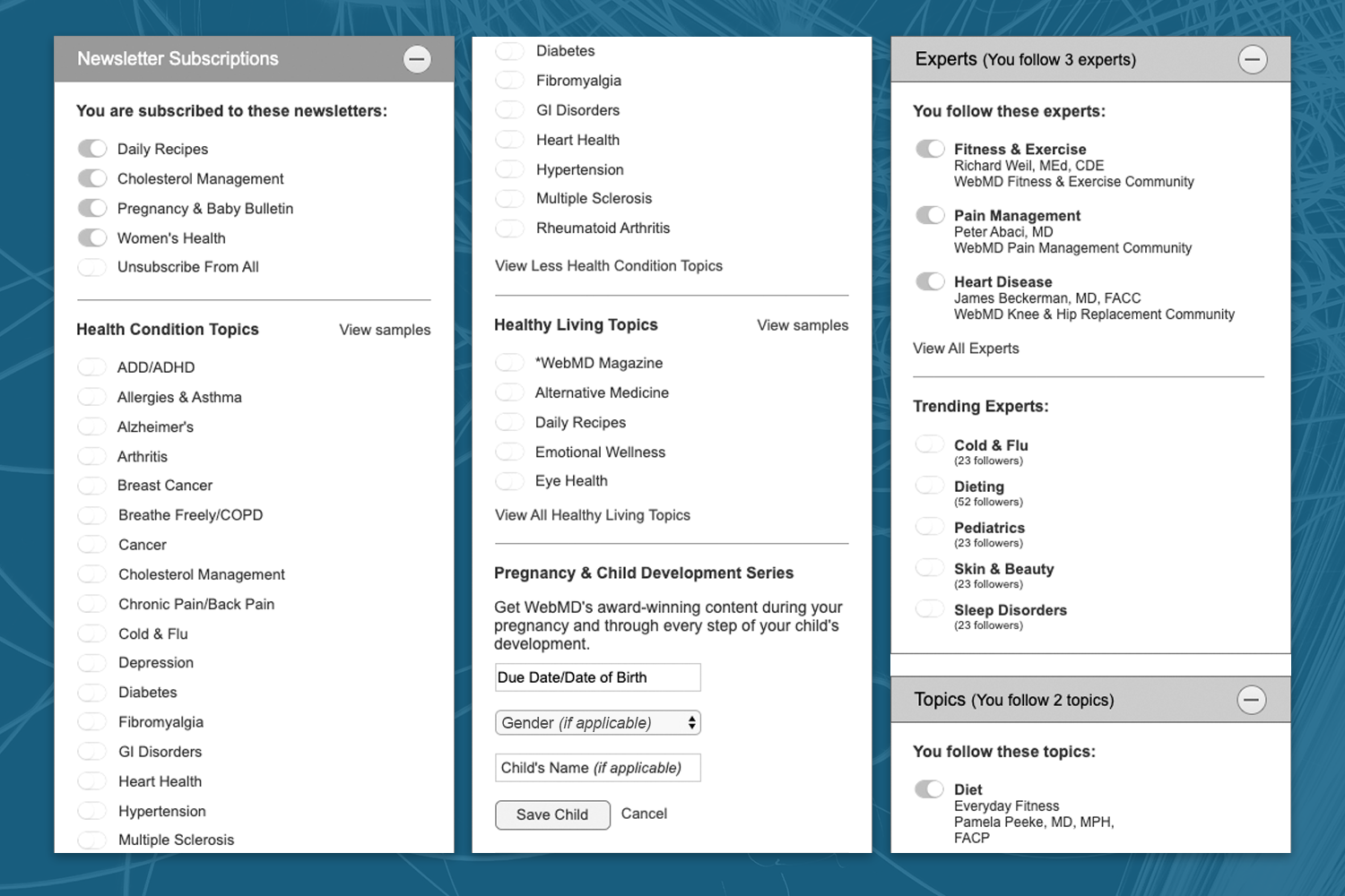 The WebMD Preference Center was very hard for users to navigate because its design lacked clear organization. Users found it difficult to locate relevant subscription options and customize their preferences due to cluttered layout and confusing navigation pathways. Additionally, it did not adequately guide users through the subscription process or provide clear instructions, leading to frustration and abandonment.